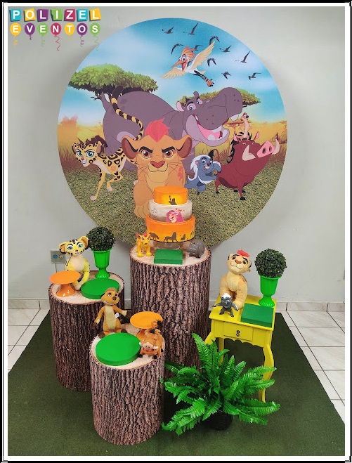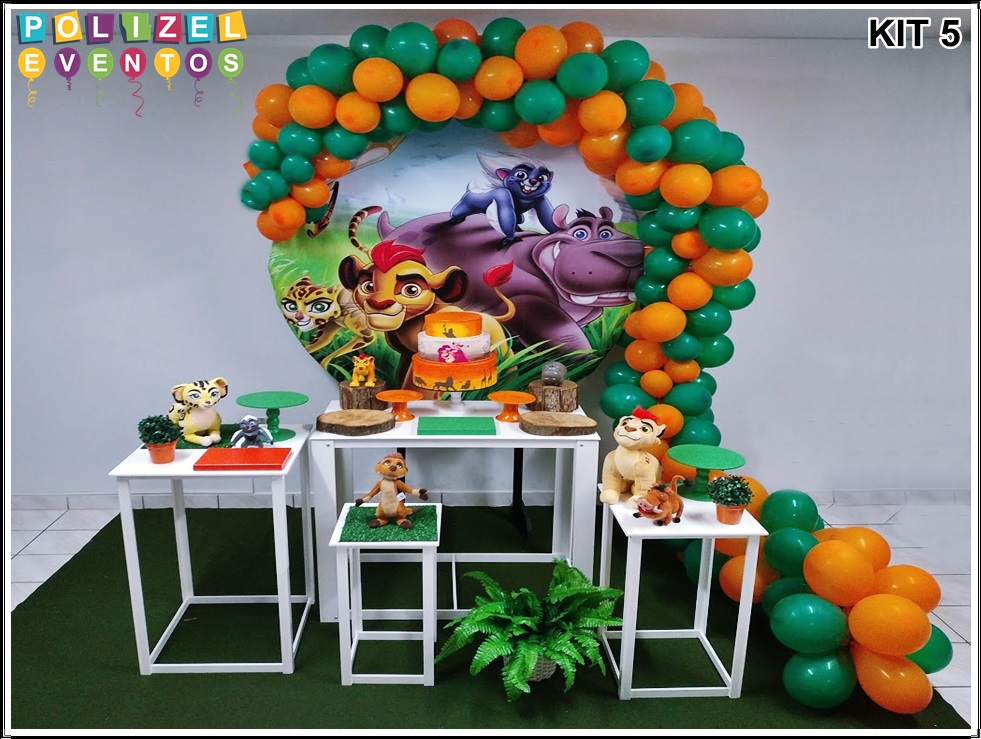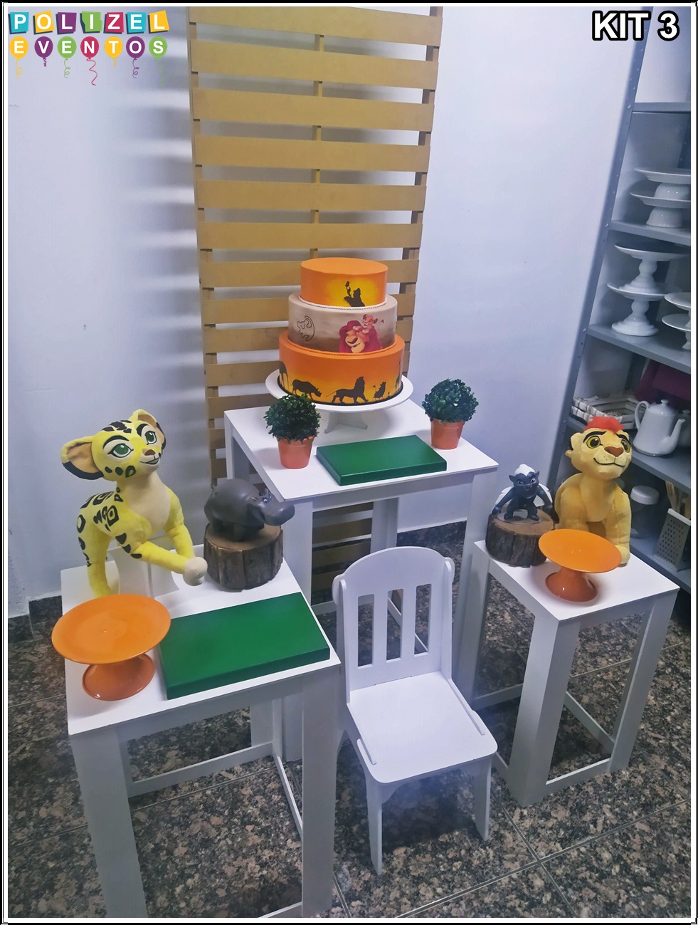 Todas as decorações contém fundo (tecido ou telado com balões), móveis (clássicos ou rústicos), bolo cenográfico e mesa de brinquedos