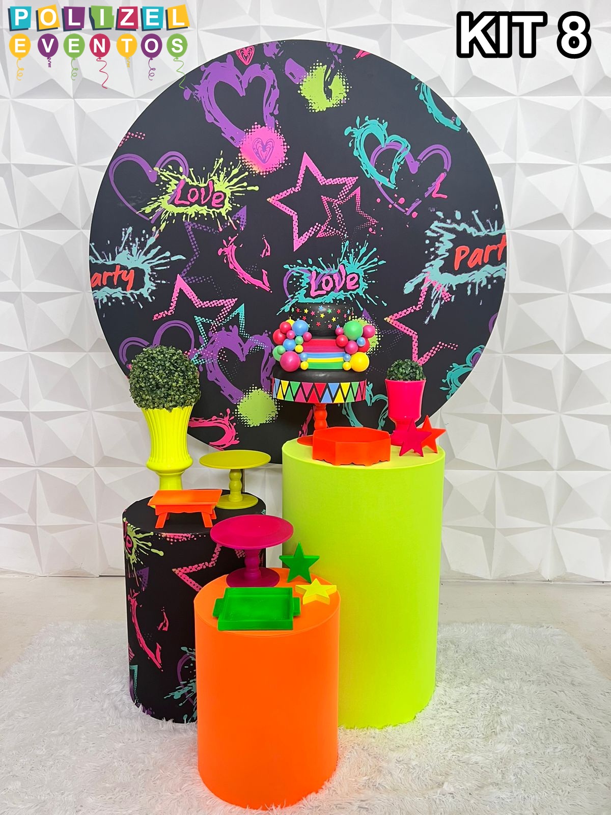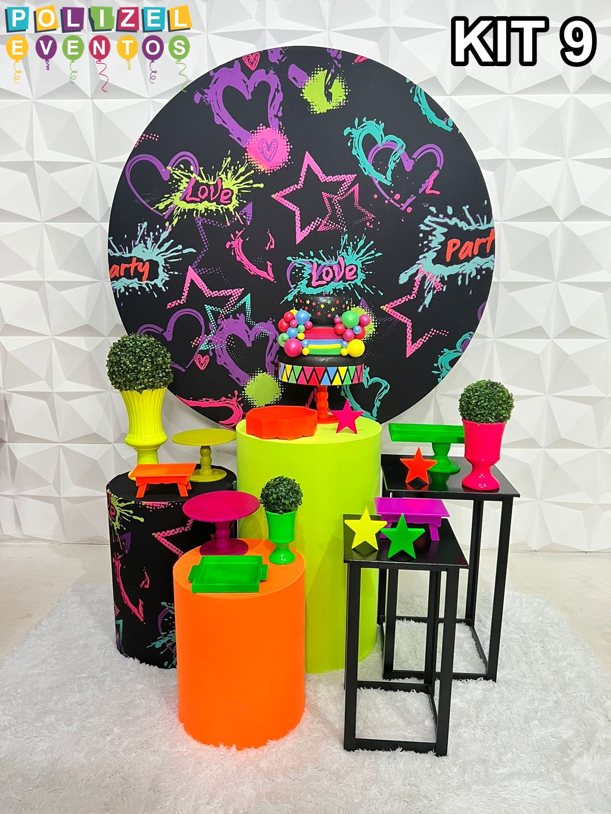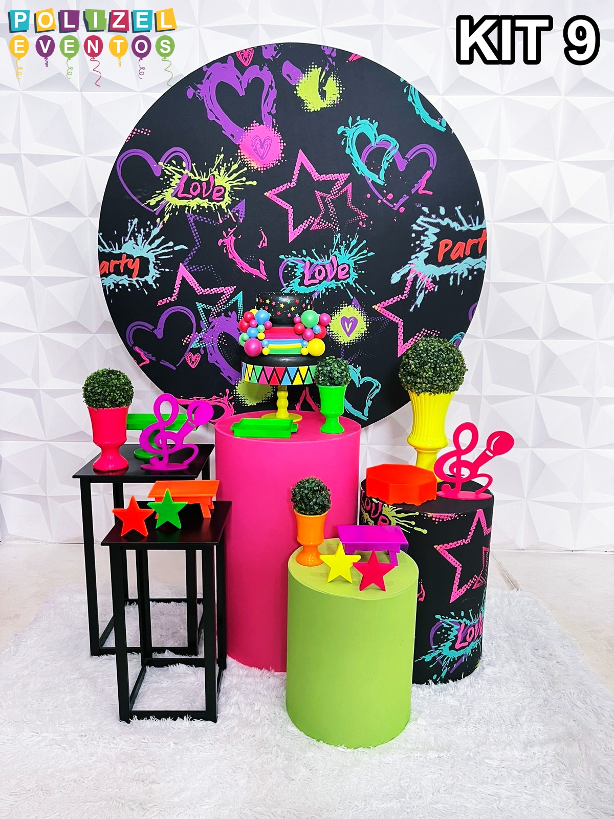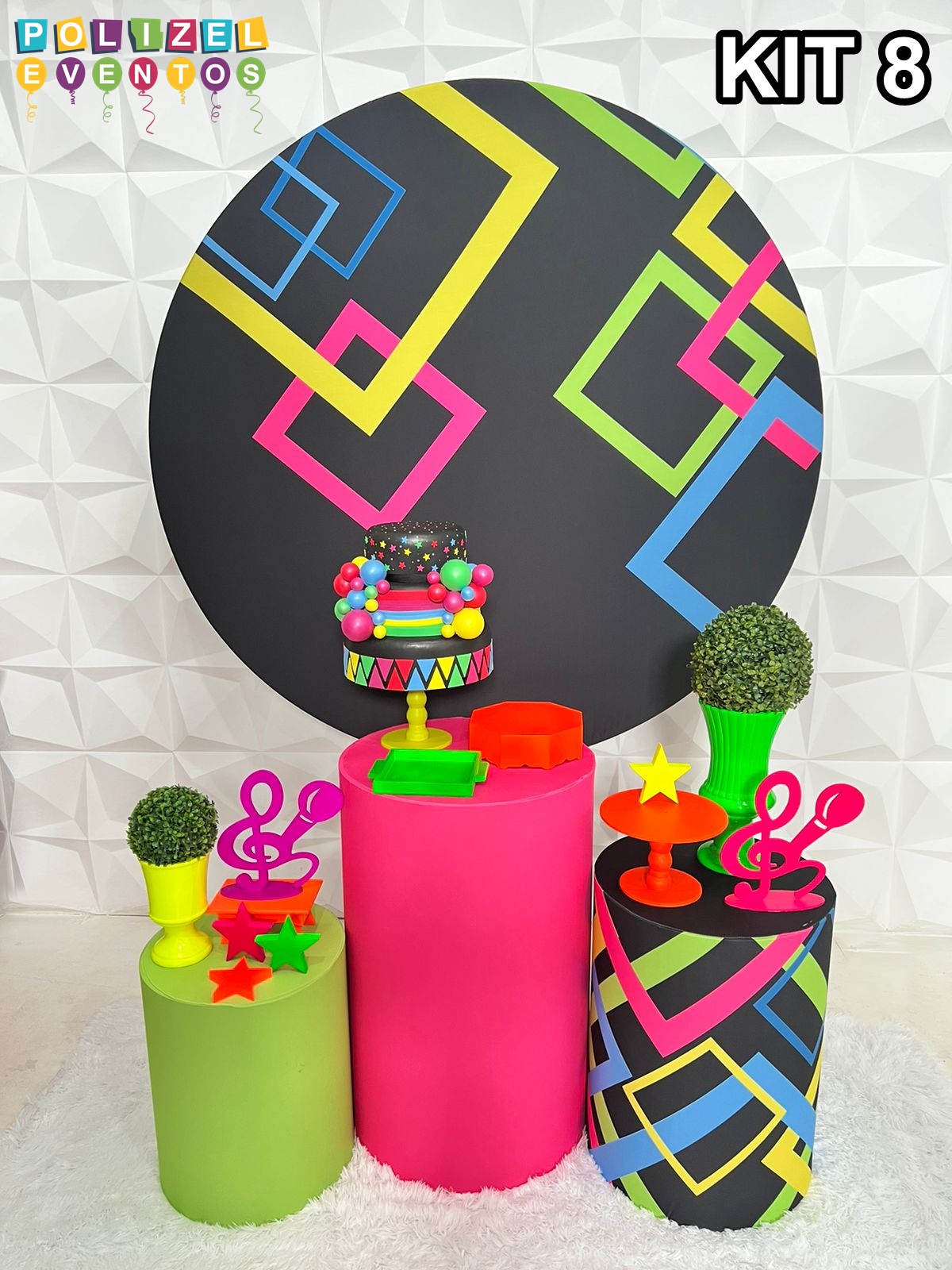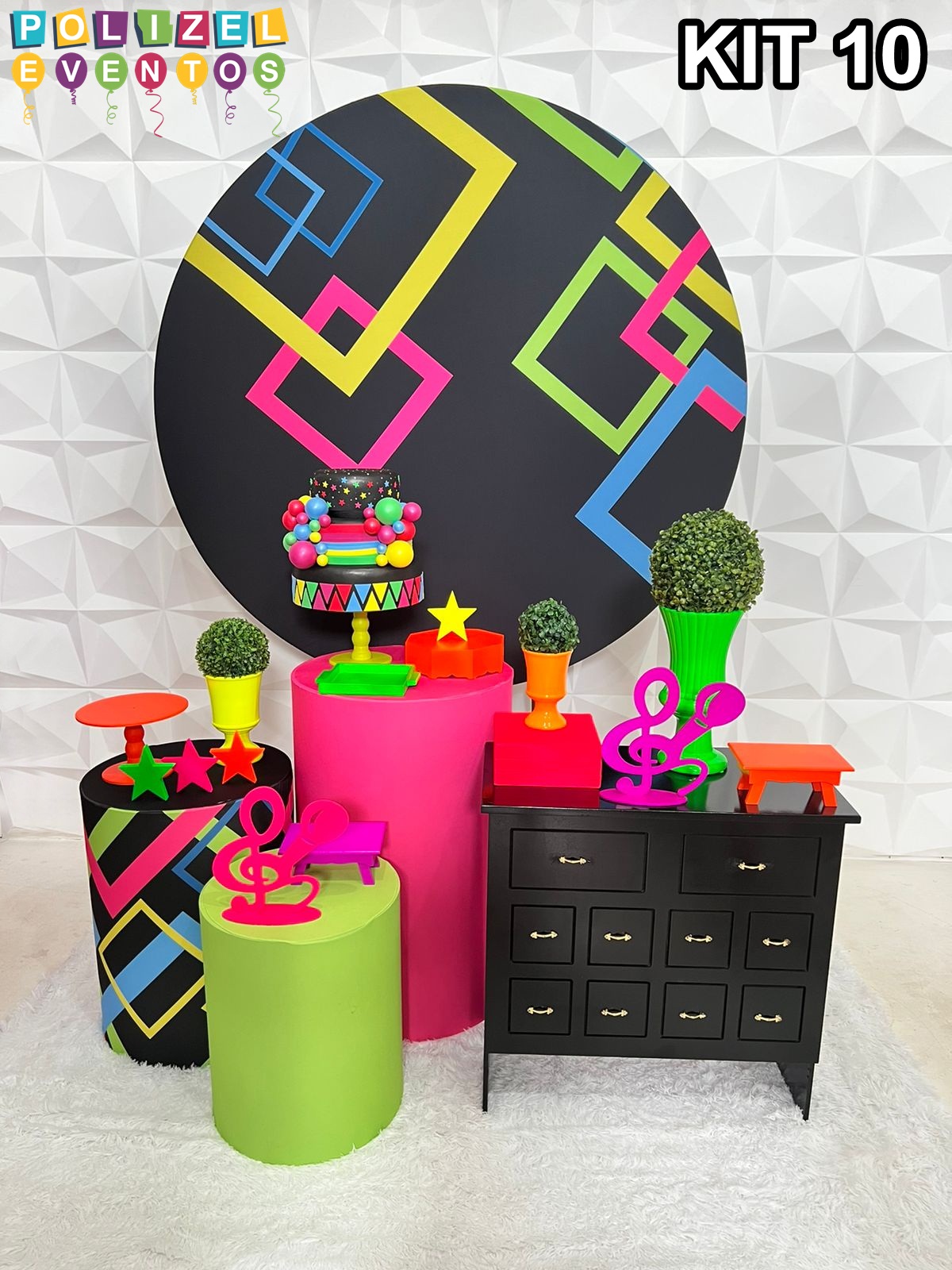 Todas as decorações contém fundo (tecido ou telado com balões), móveis (clássicos ou rústicos), bolo cenográfico e mesa de brinquedos