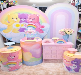Todas as decorações contém fundo (tecido ou telado com balões), móveis (clássicos ou rústicos), bolo cenográfico e mesa de brinquedos
