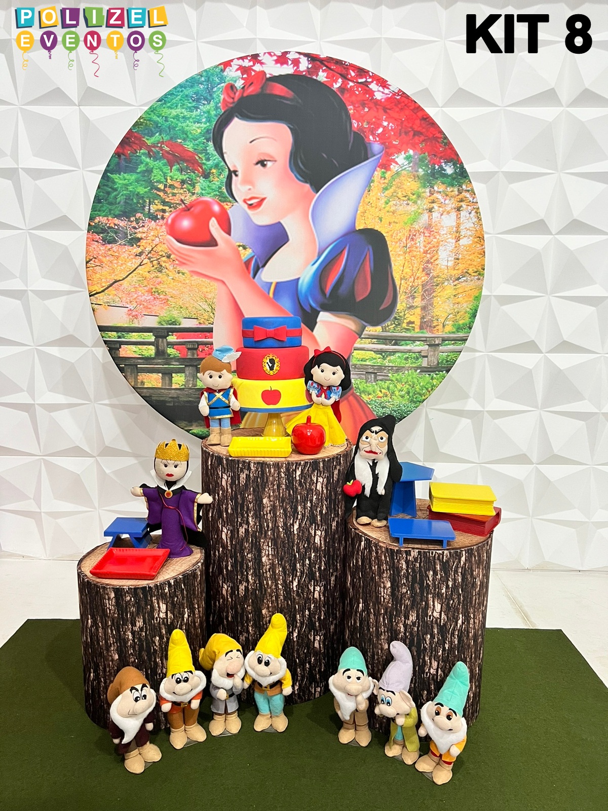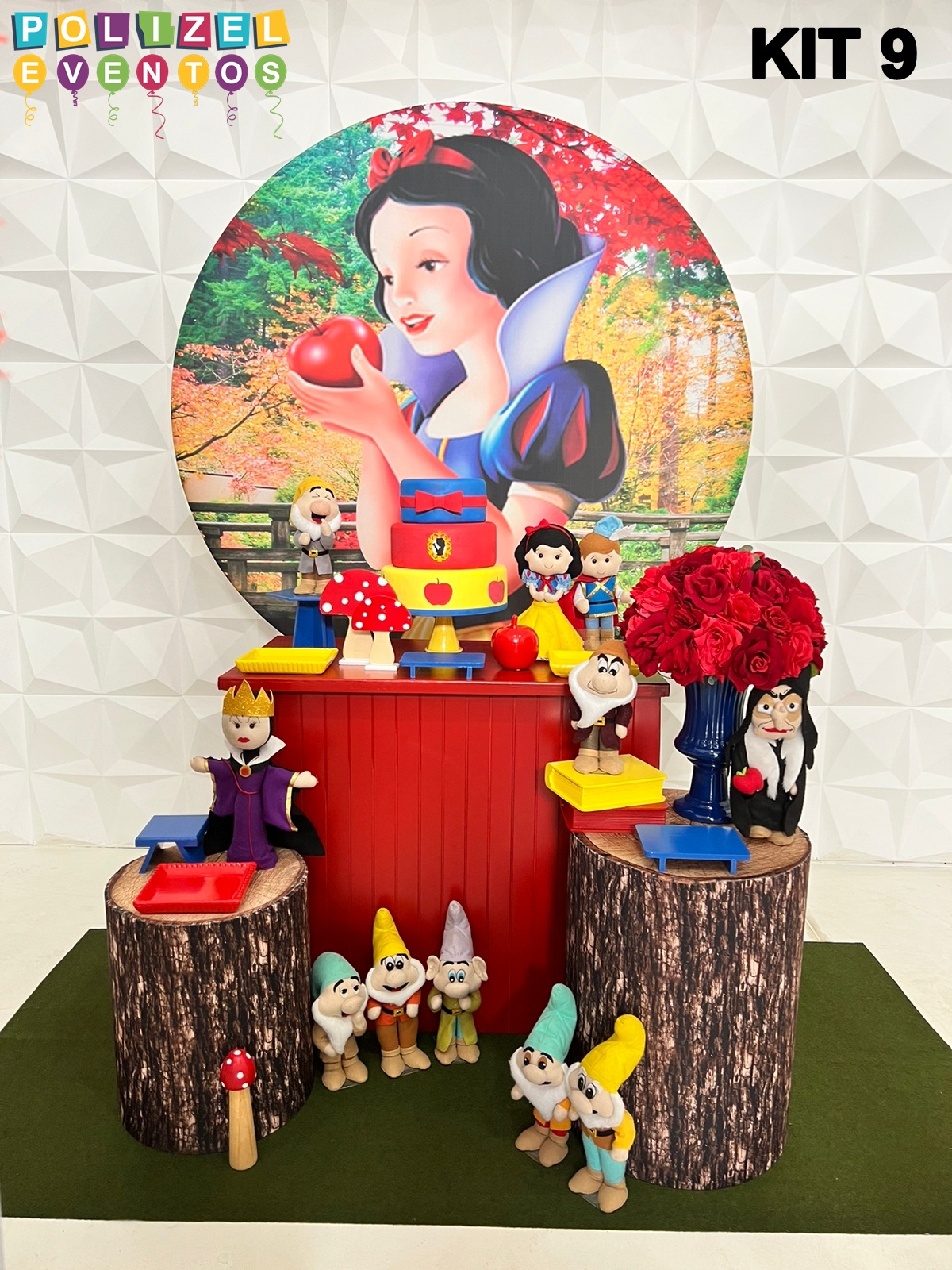 Todas as decorações contém fundo (tecido ou telado com balões), móveis (clássicos ou rústicos), bolo cenográfico e mesa de brinquedos
