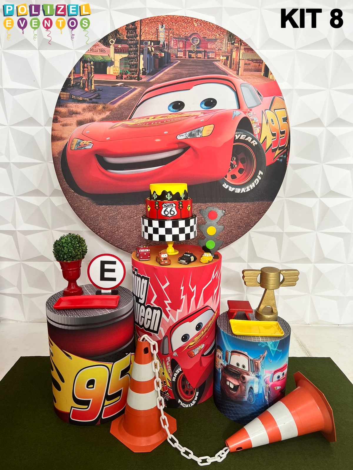Todas as decorações contém fundo (tecido ou telado com balões), móveis (clássicos ou rústicos), bolo cenográfico e mesa de brinquedos