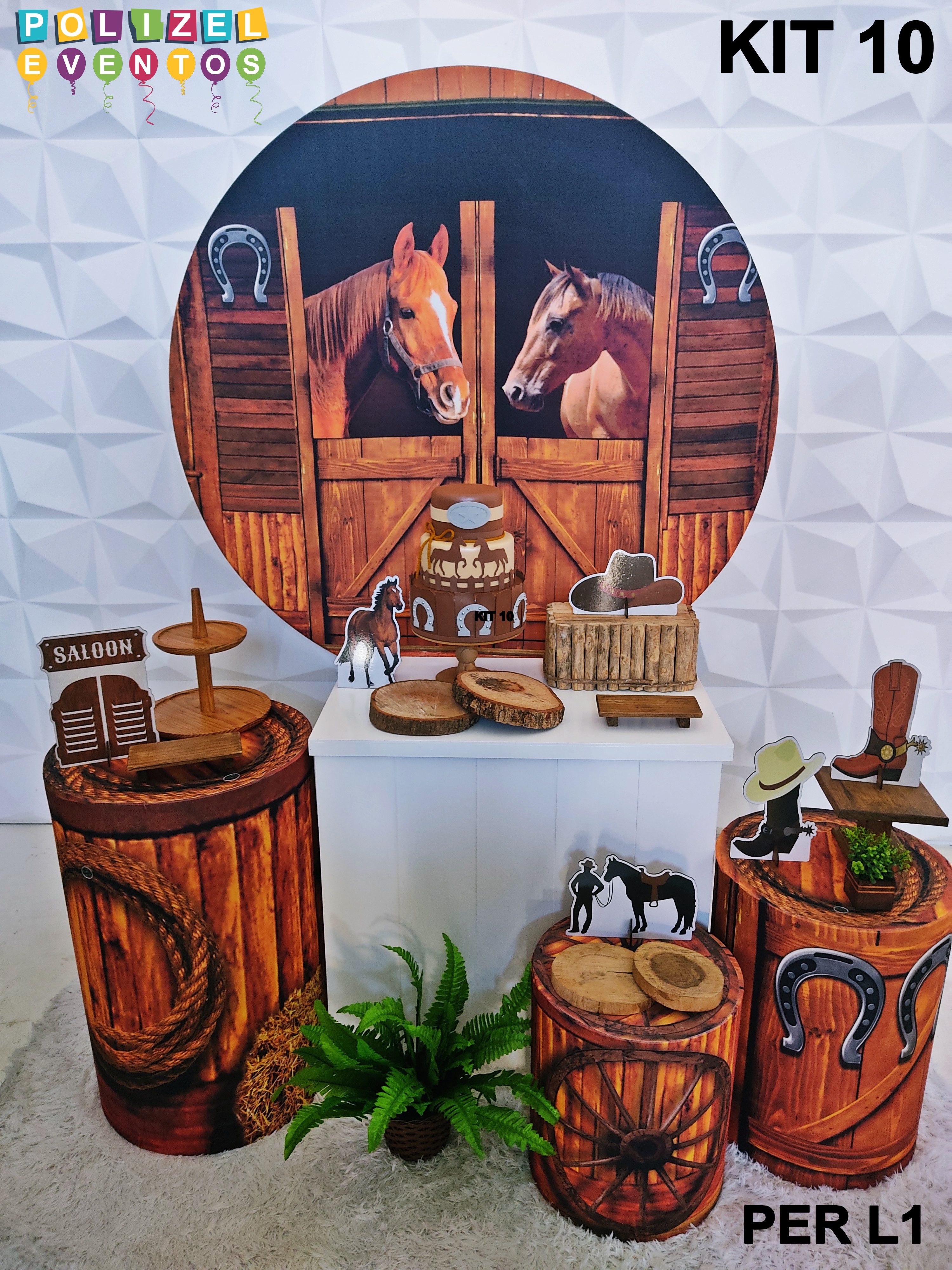Todas as decorações contém fundo (tecido ou telado com balões), móveis (clássicos ou rústicos), bolo cenográfico e mesa de brinquedos