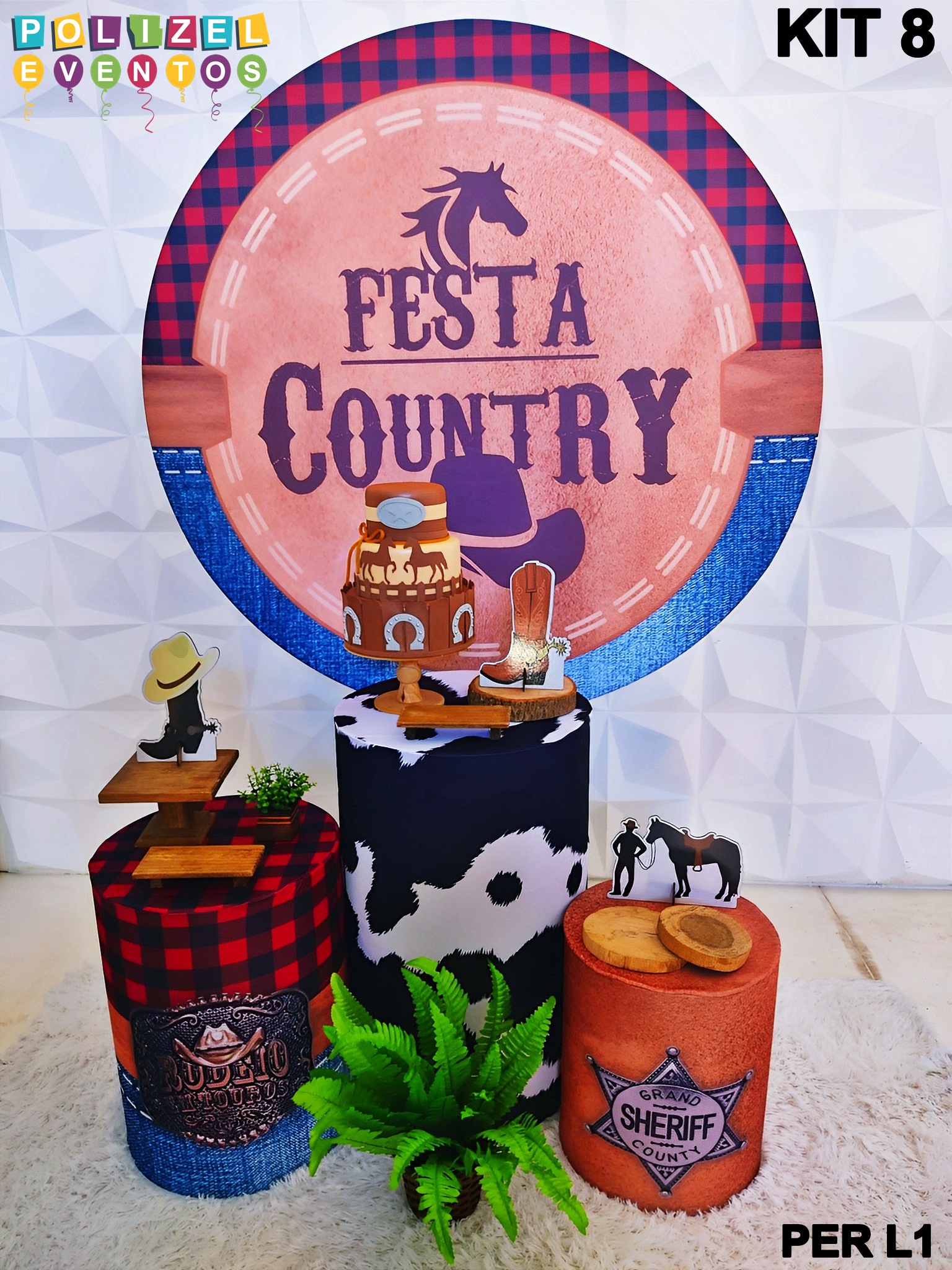 Todas as decorações contém fundo (tecido ou telado com balões), móveis (clássicos ou rústicos), bolo cenográfico e mesa de brinquedos