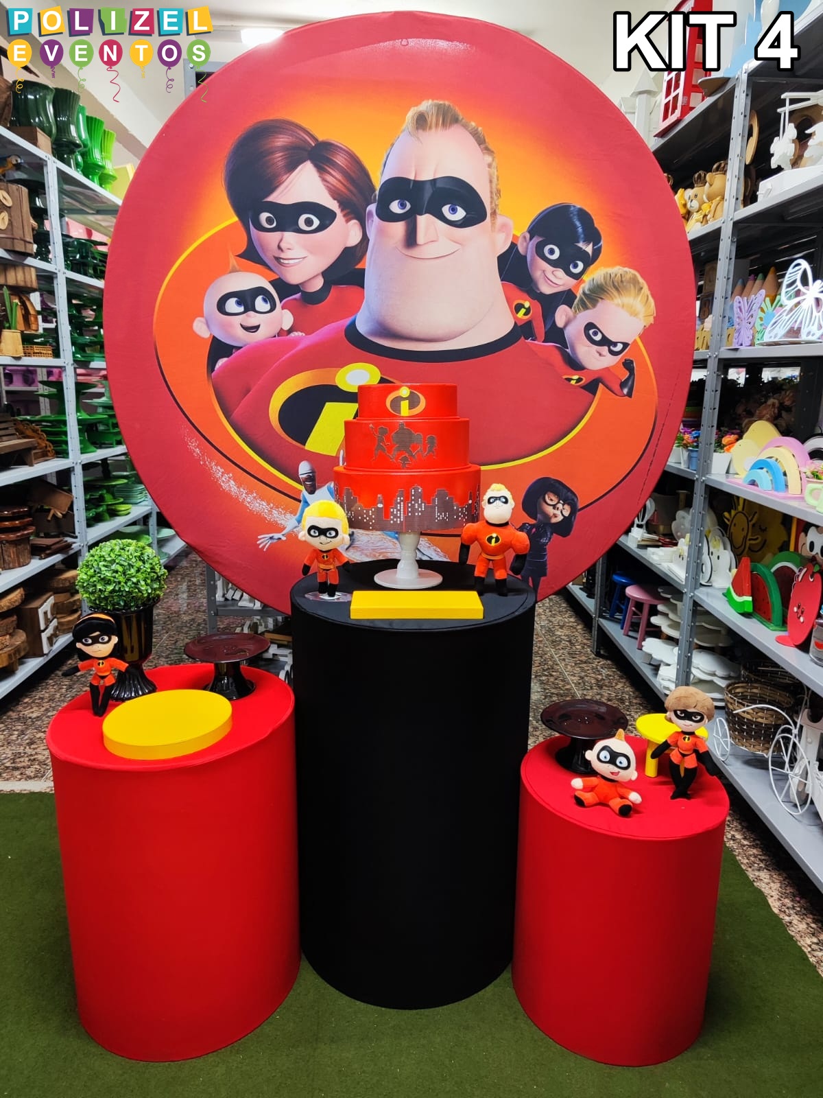 Todas as decorações contém fundo (tecido ou telado com balões), móveis (clássicos ou rústicos), bolo cenográfico e mesa de brinquedos