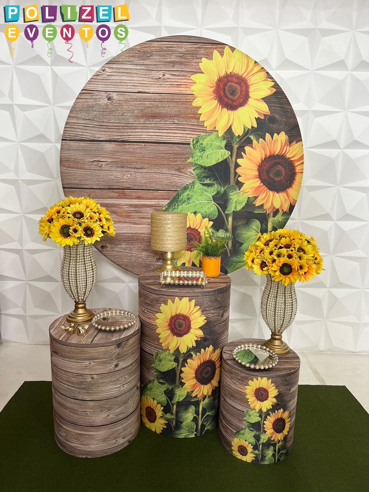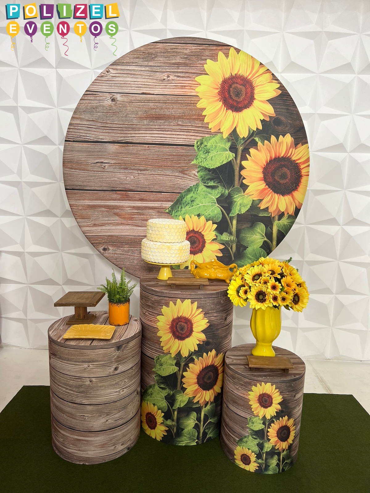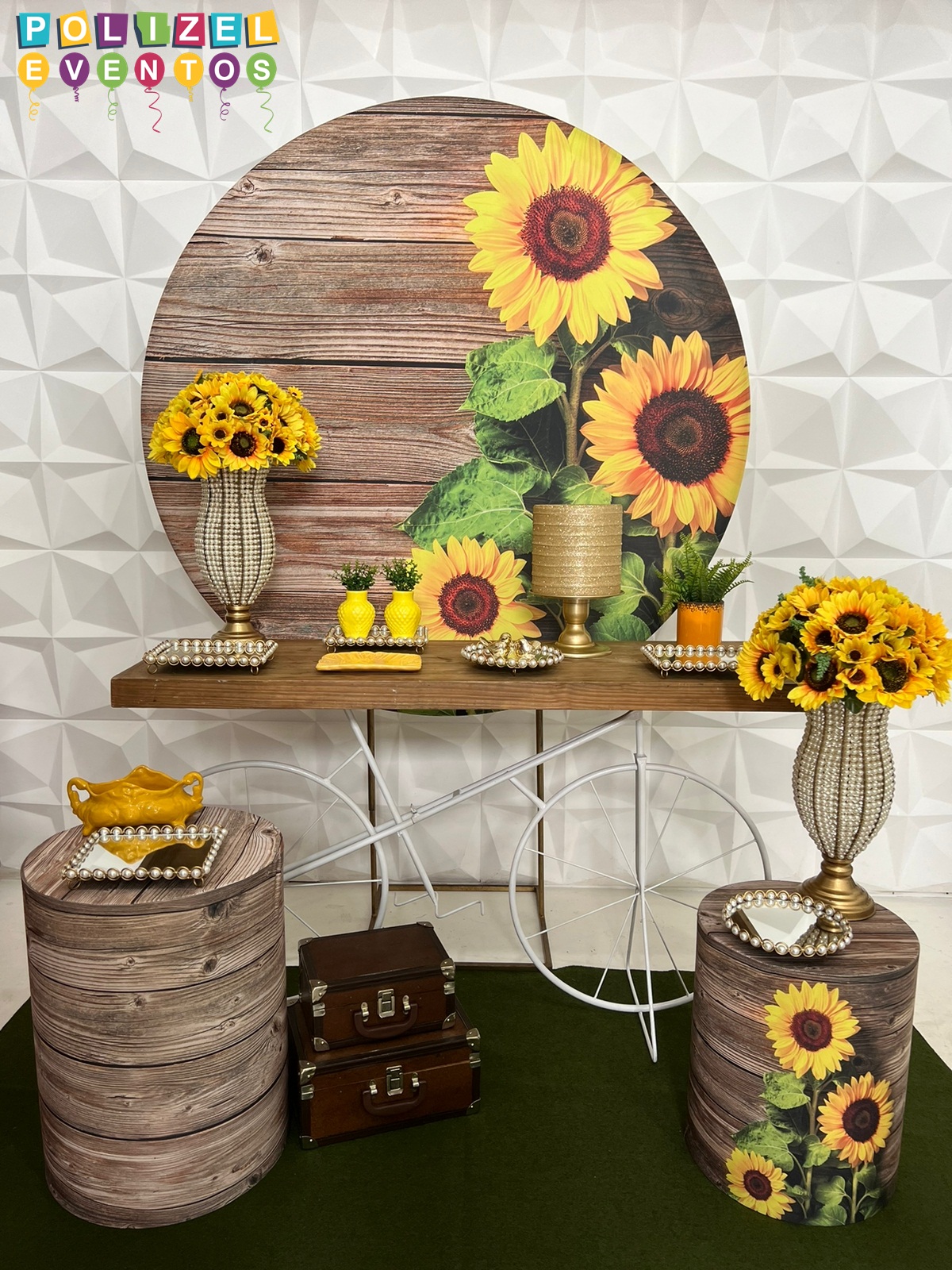 Todas as decorações contém fundo (tecido ou telado com balões), móveis (clássicos ou rústicos), bolo cenográfico e mesa de brinquedos