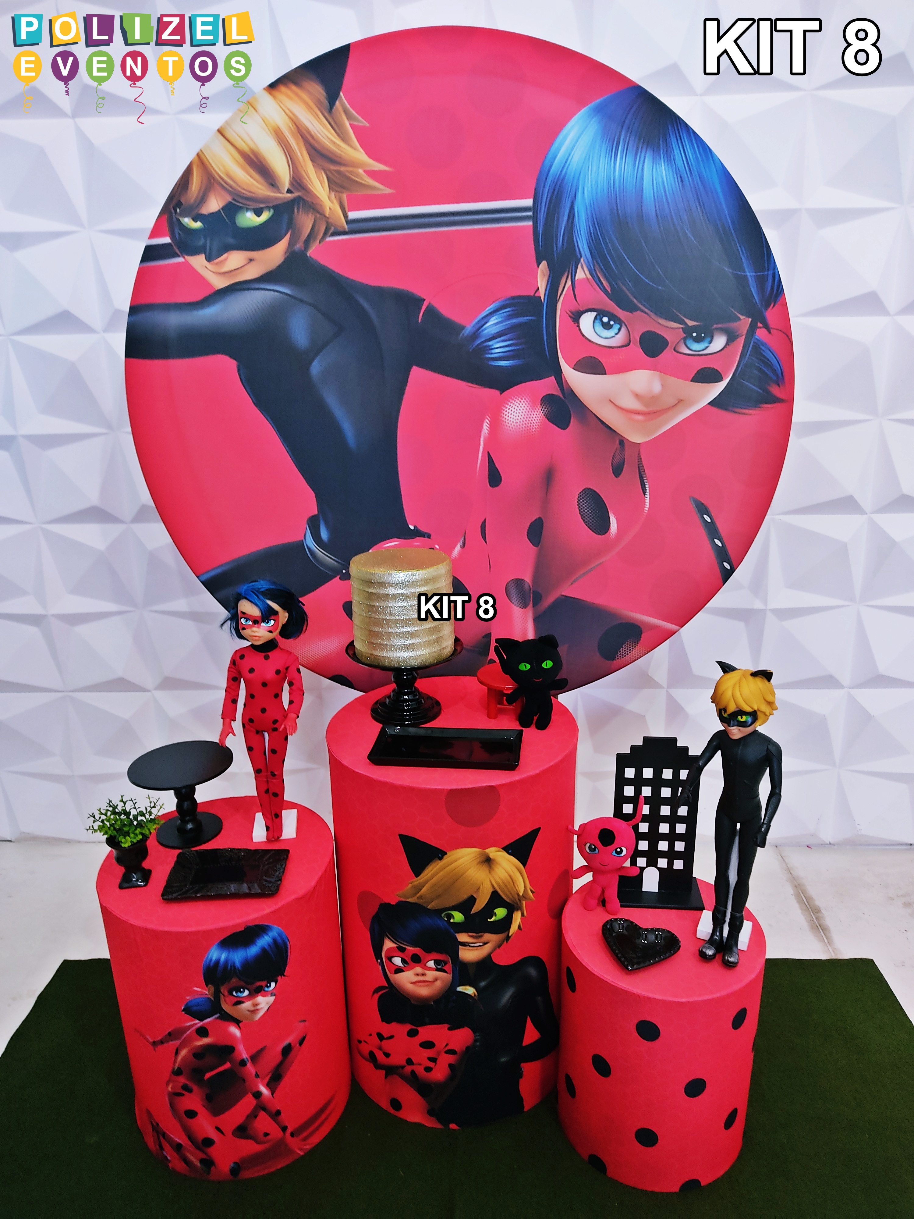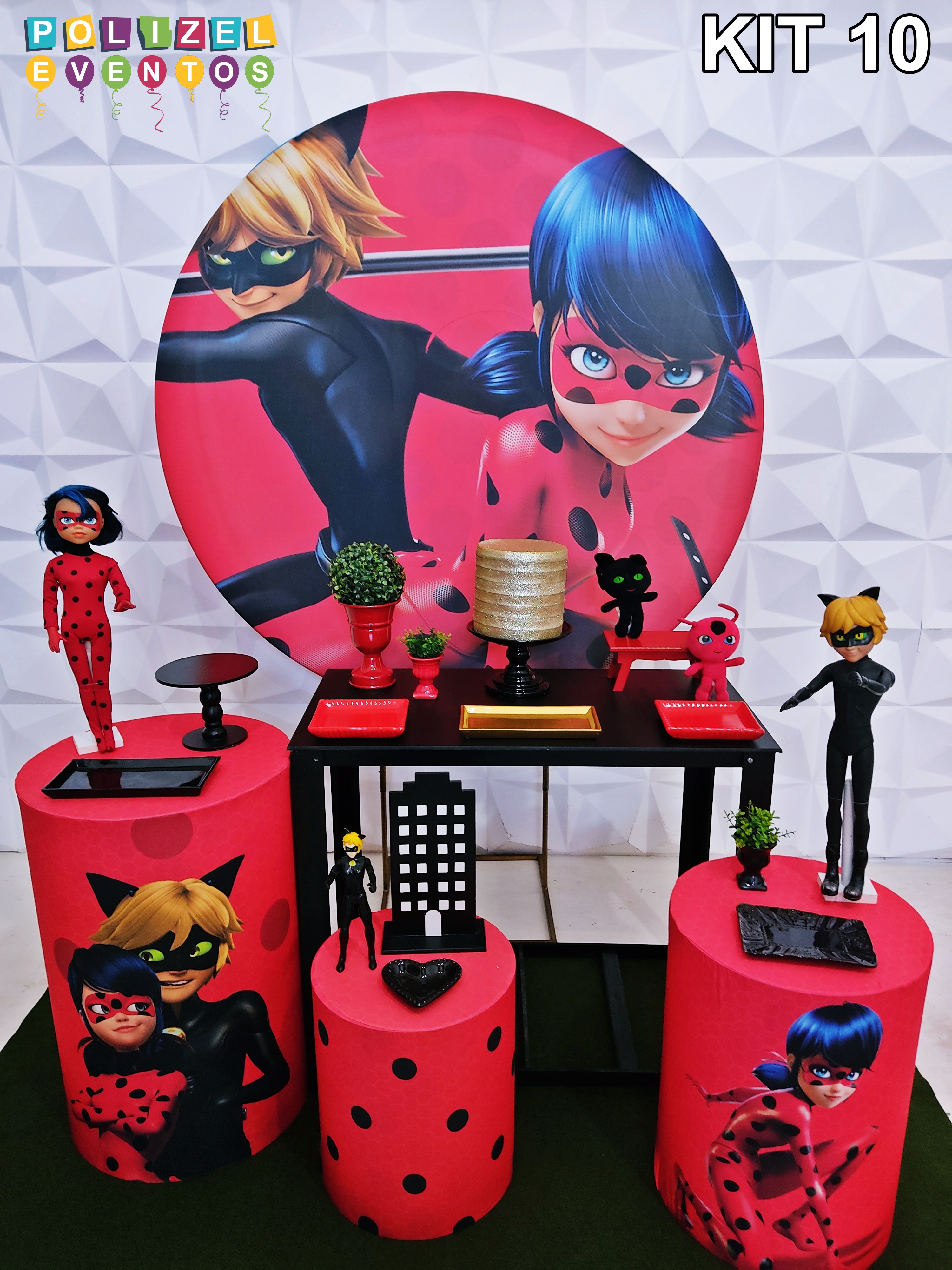 Todas as decorações contém fundo (tecido ou telado com balões), móveis (clássicos ou rústicos), bolo cenográfico e mesa de brinquedos