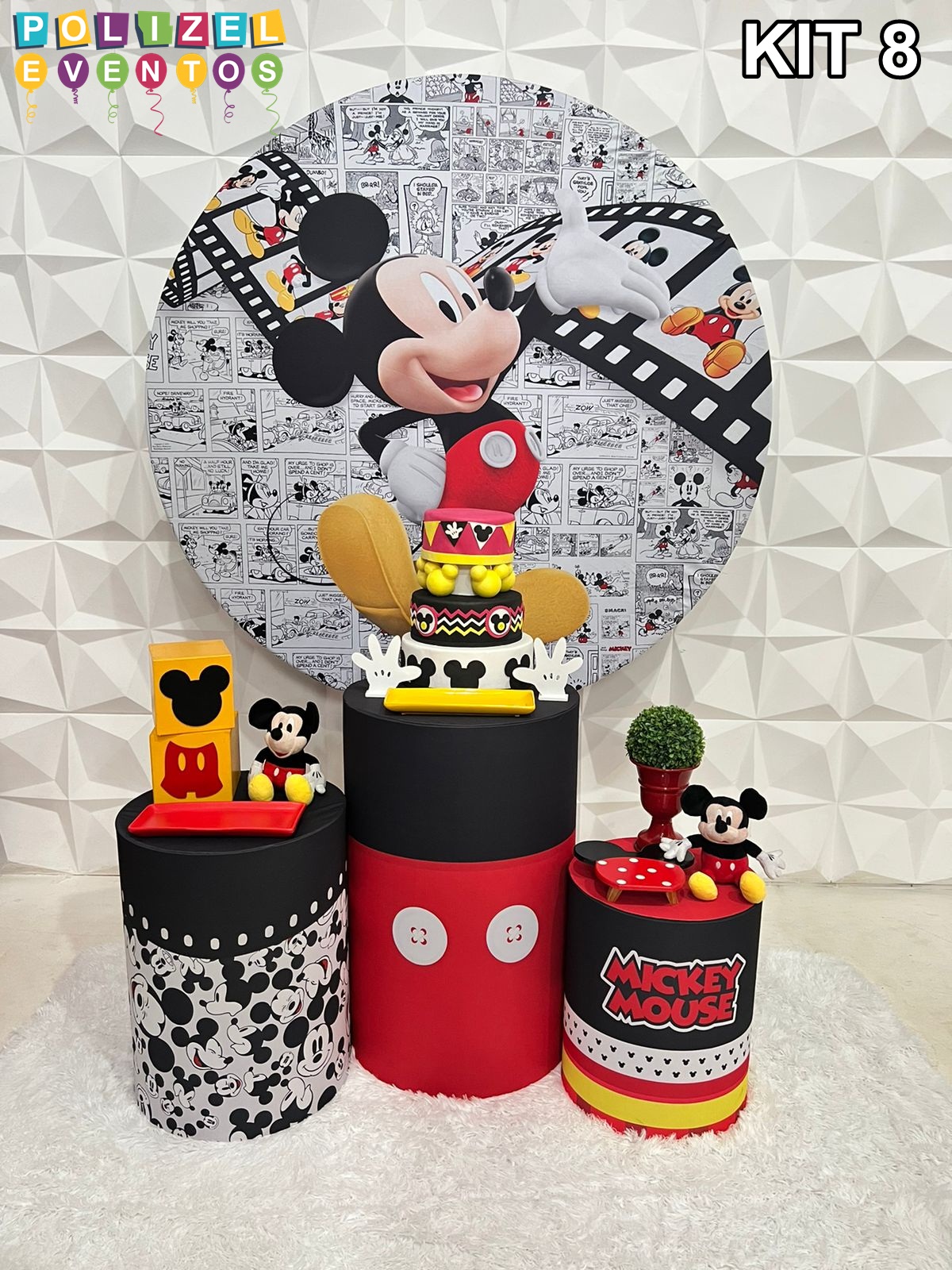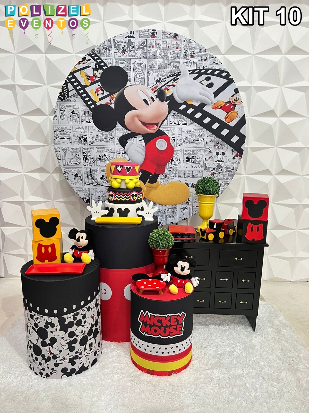 Todas as decorações contém fundo (tecido ou telado com balões), móveis (clássicos ou rústicos), bolo cenográfico e mesa de brinquedos