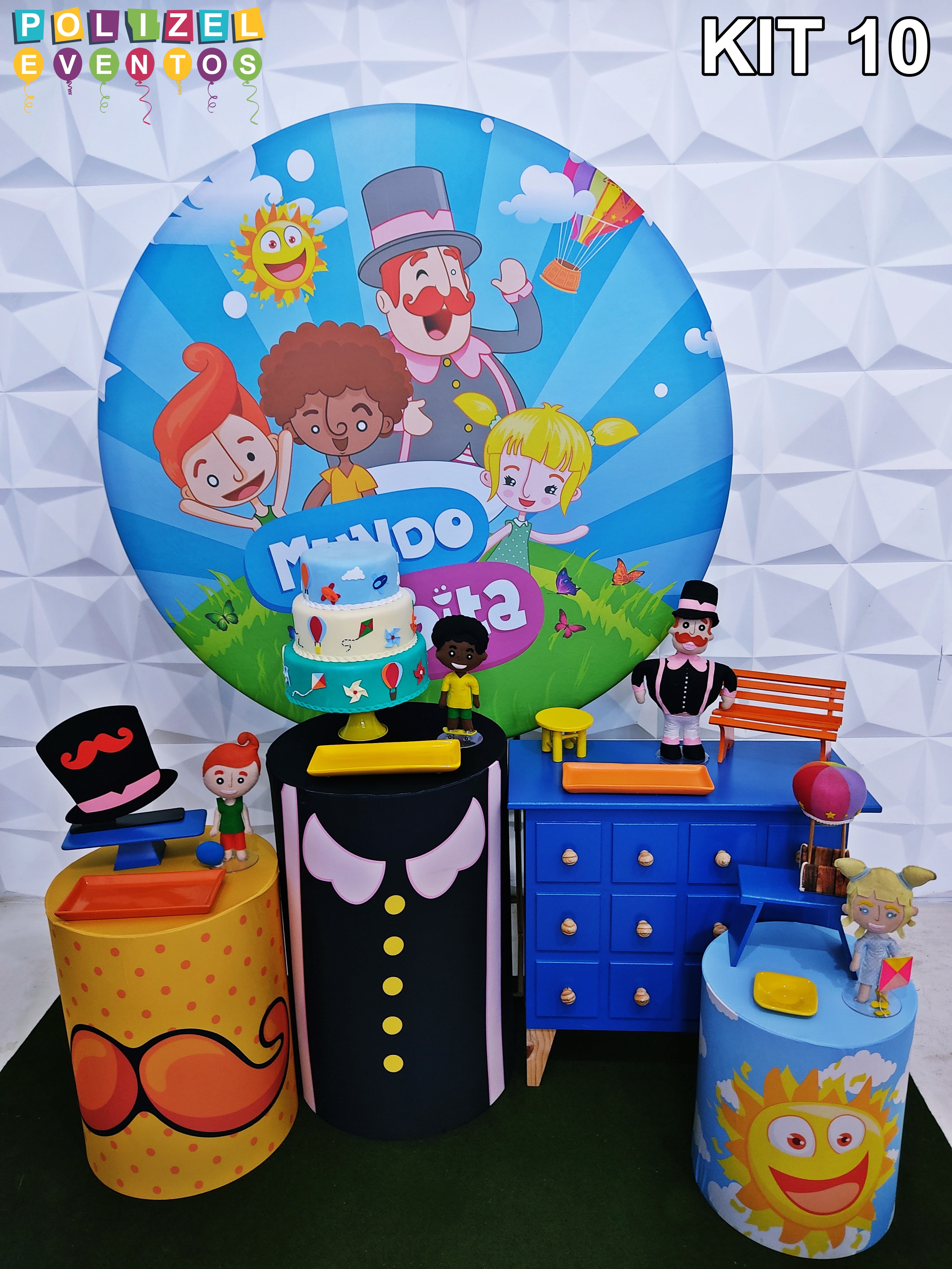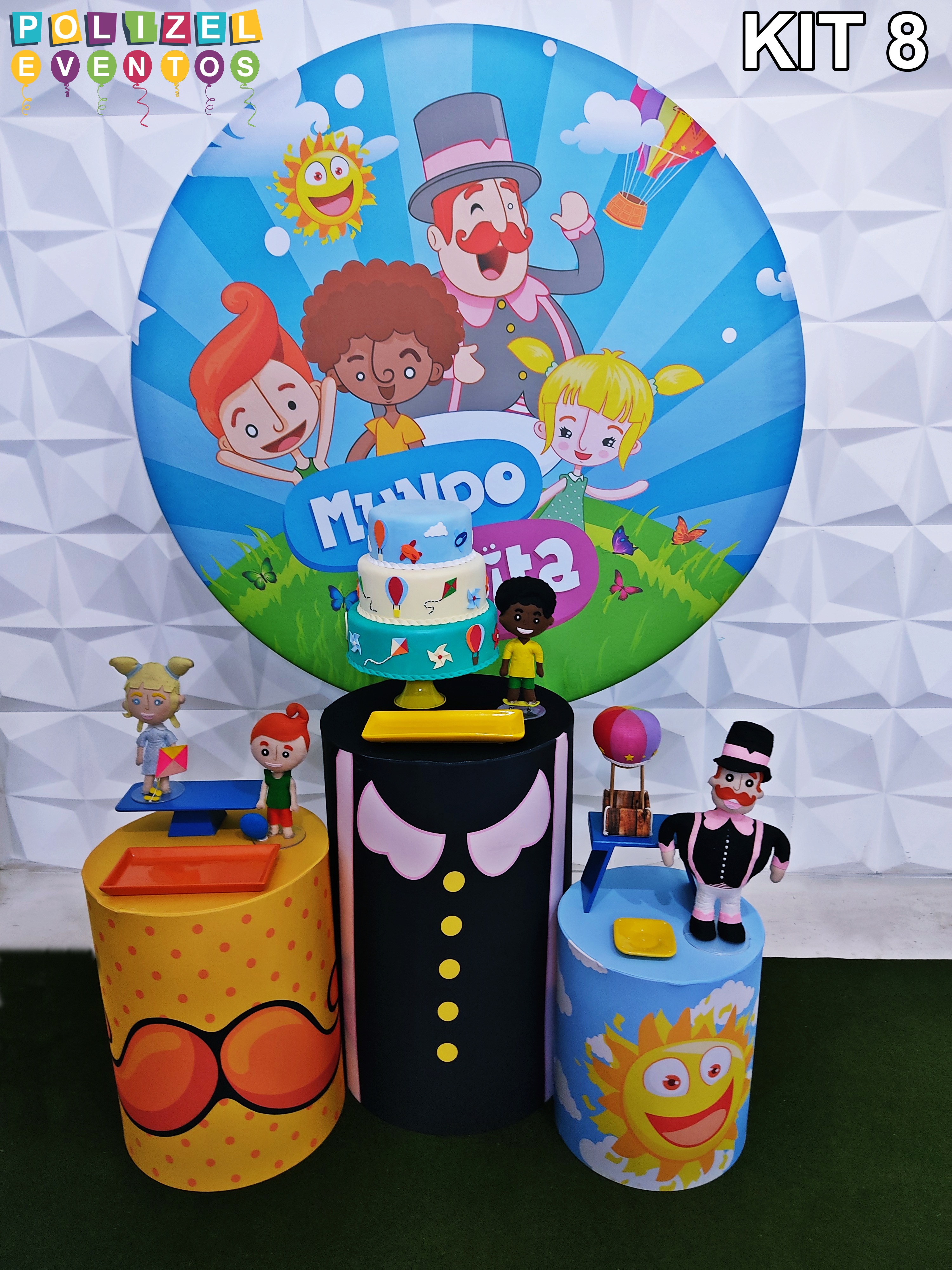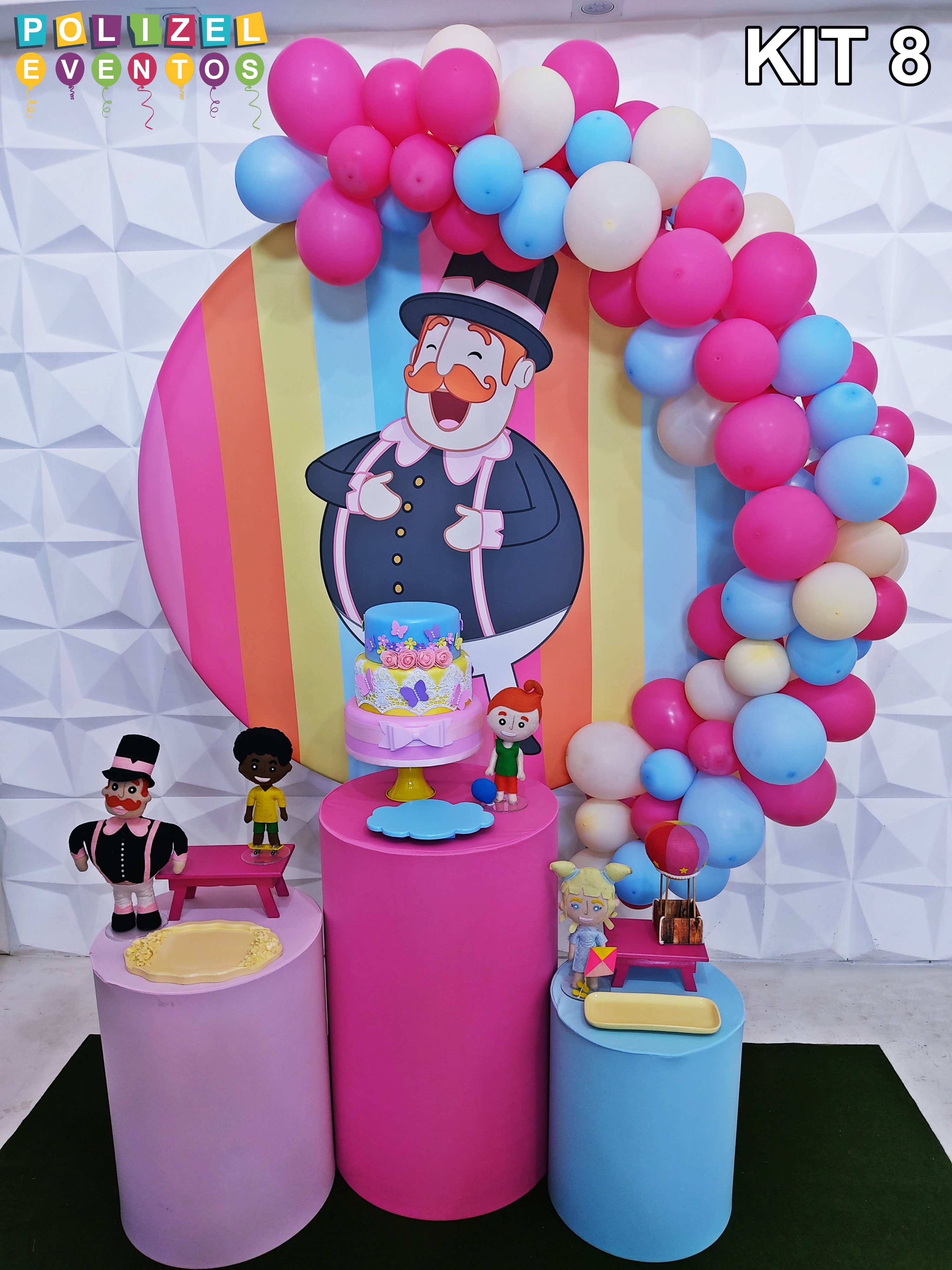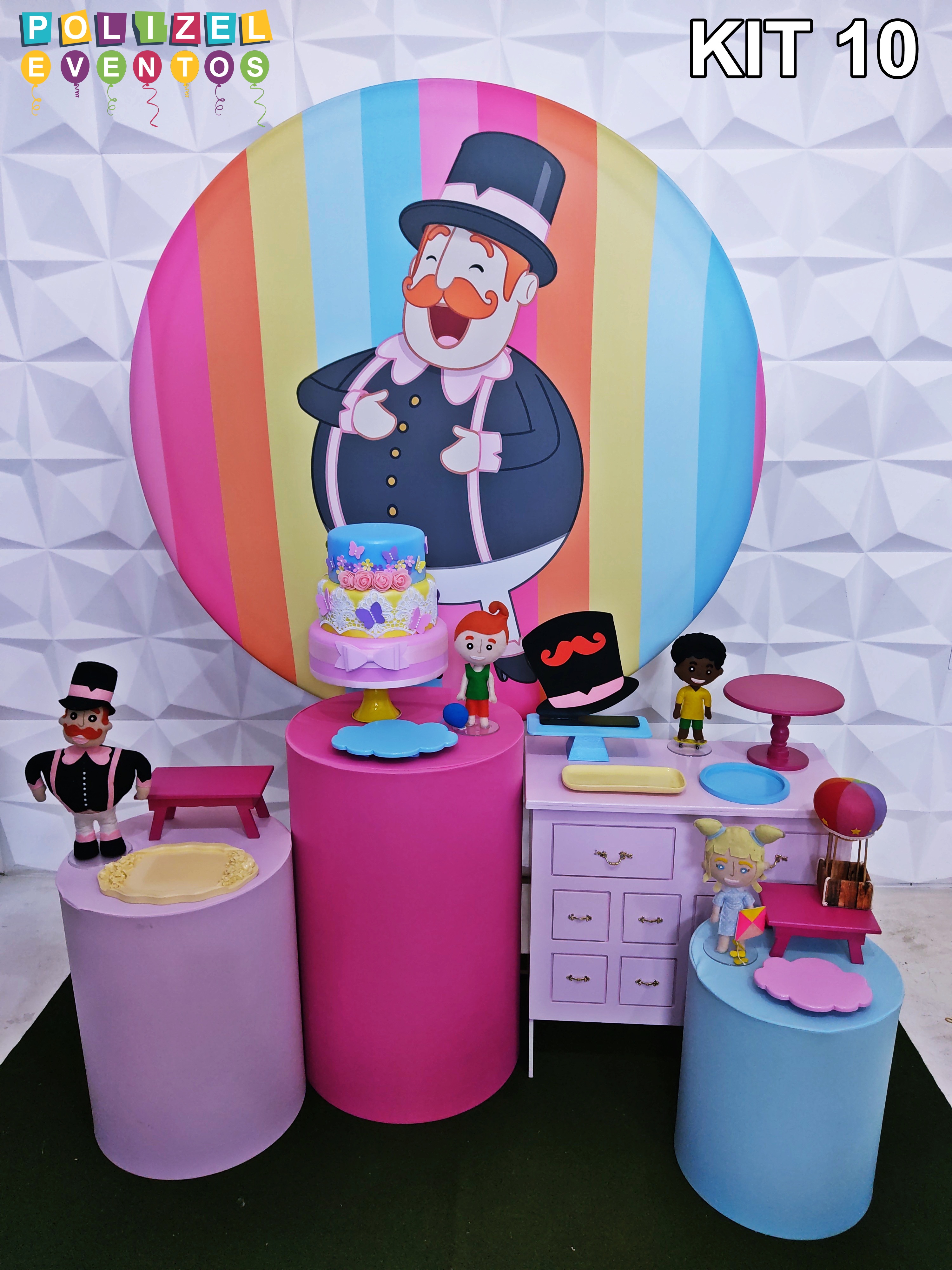 Todas as decorações contém fundo (tecido ou telado com balões), móveis (clássicos ou rústicos), bolo cenográfico e mesa de brinquedos