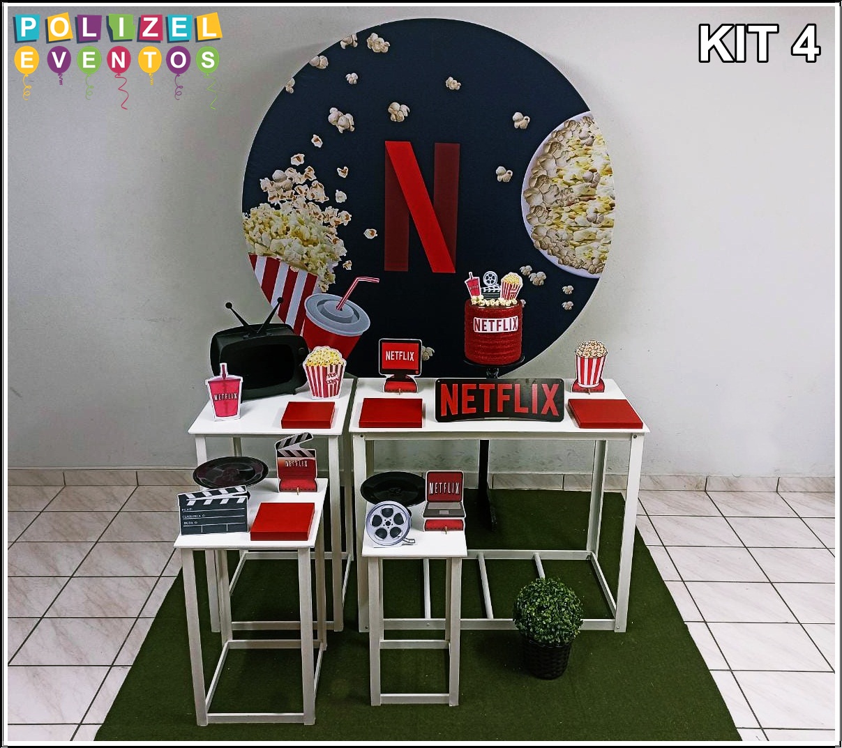 Todas as decorações contém fundo (tecido ou telado com balões), móveis (clássicos ou rústicos), bolo cenográfico e mesa de brinquedos