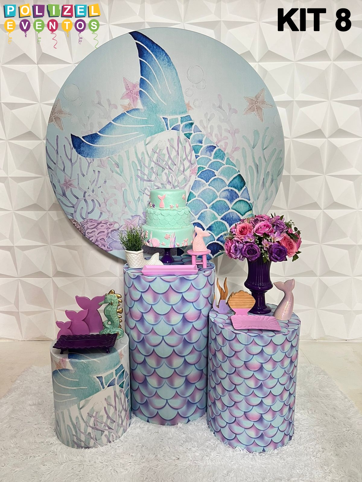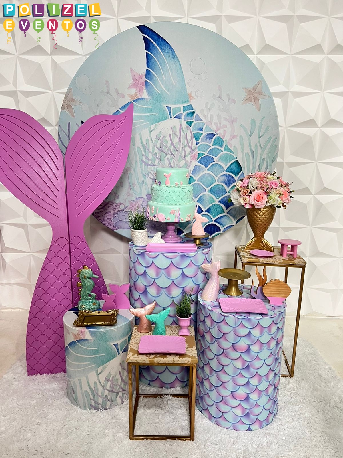 Todas as decorações contém fundo (tecido ou telado com balões), móveis (clássicos ou rústicos), bolo cenográfico e mesa de brinquedos