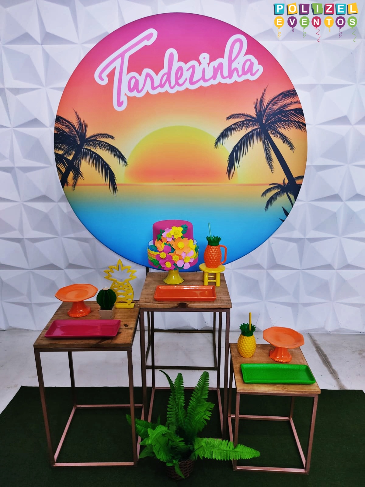 Todas as decorações contém fundo (tecido ou telado com balões), móveis (clássicos ou rústicos), bolo cenográfico e mesa de brinquedos