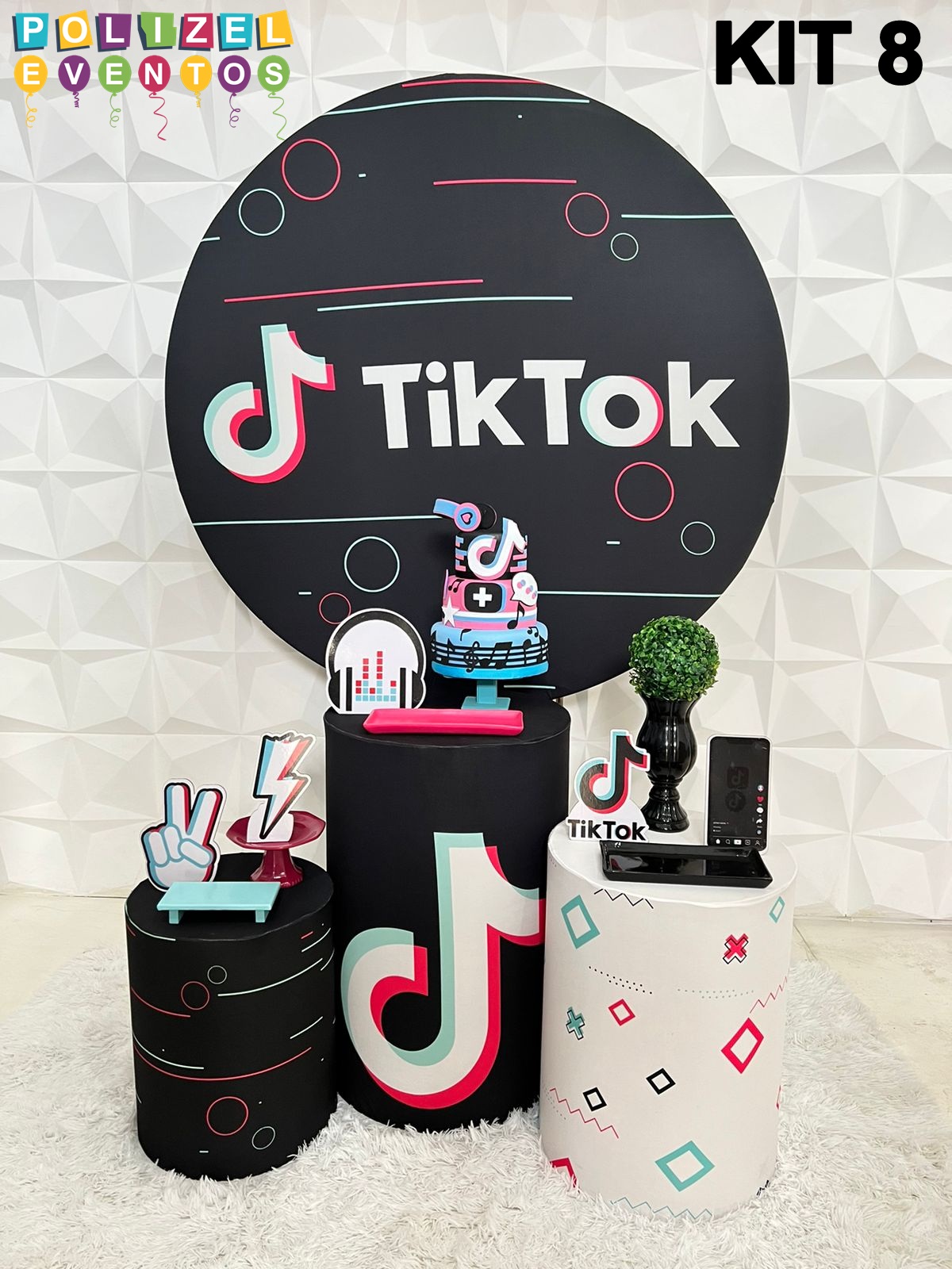 Todas as decorações contém fundo (tecido ou telado com balões), móveis (clássicos ou rústicos), bolo cenográfico e mesa de brinquedos
