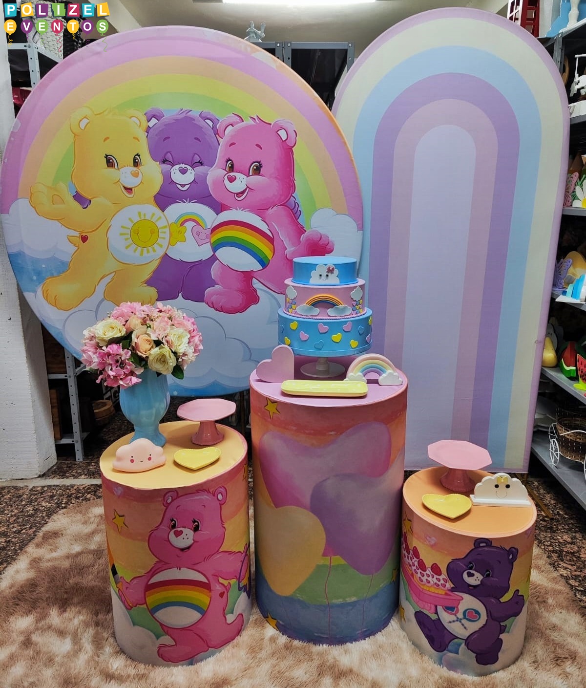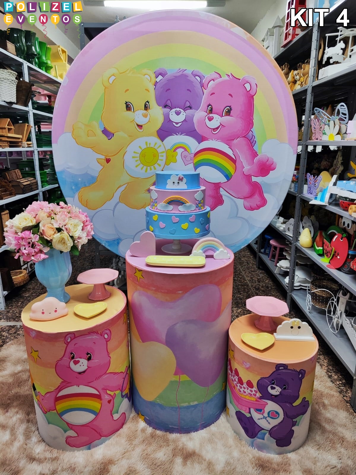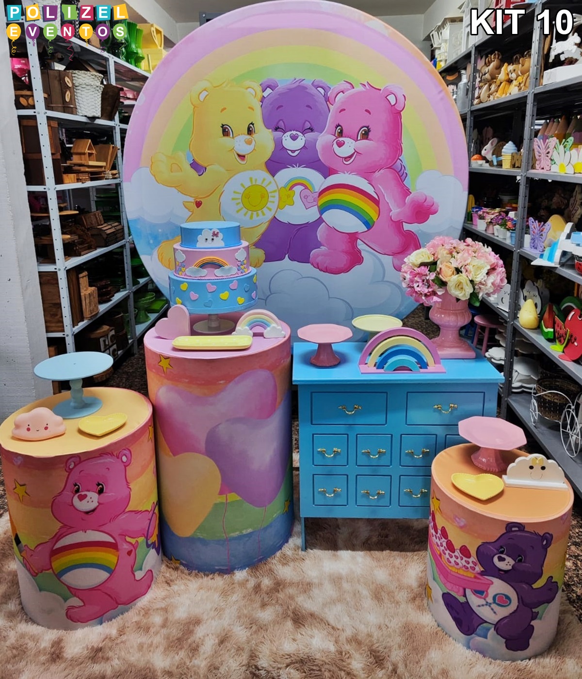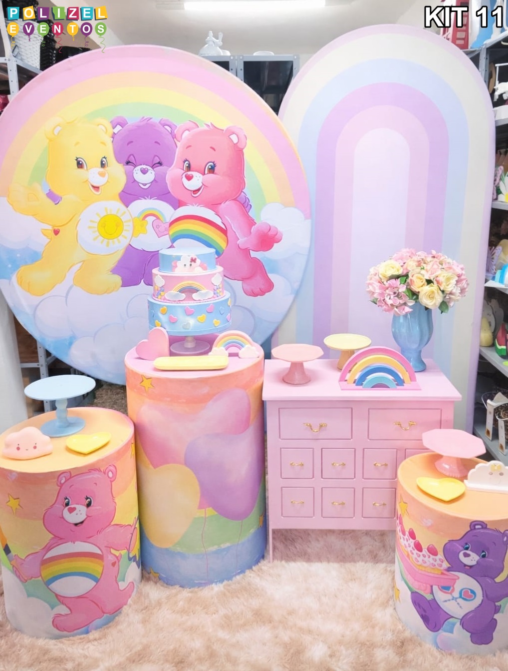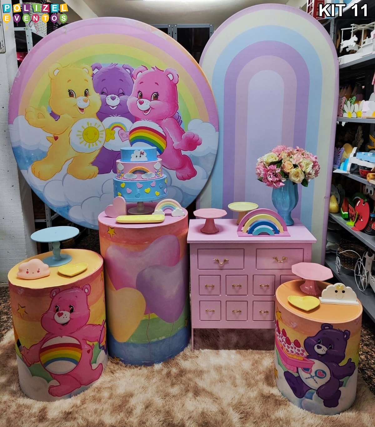 Todas as decorações contém fundo (tecido ou telado com balões), móveis (clássicos ou rústicos), bolo cenográfico e mesa de brinquedos